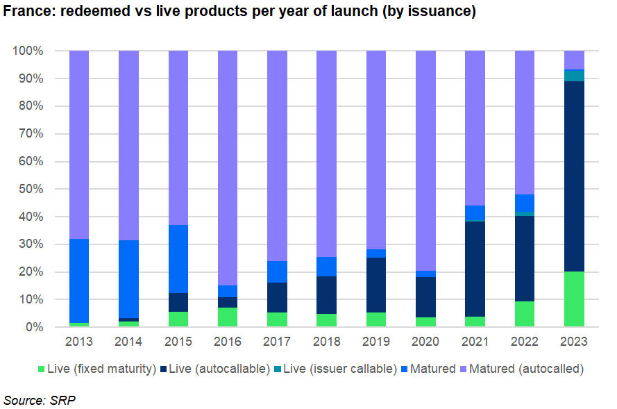 We look at the proportion of live products that are issuer callable (from 2021 onwards), autocallable, and those that have a fixed maturity while the maturing products are divided into those that have autocalled and those that matured organically.