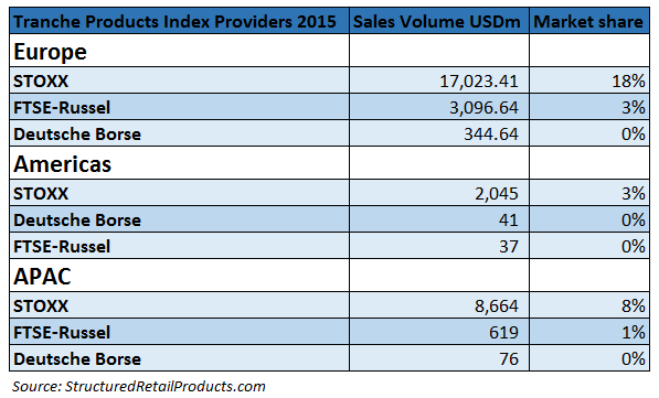 Under the terms of the 'potential merger' the new company will manage the licensing of the respective index provider firms within each party. Deutsche Borse's Stoxx features in over 140,000 structured products that are still live globally. Germany (110,777) has the highest number of products featuring Stoxx's underlyings, followed by Austria (76,988) and South Korea (15,420). The most active providers of products linked to Stoxx's indices are Deutsche Bank (20,816), followed by Societe Generale (14,269) and BNP Paribas (13,646).