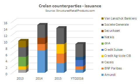 The note is issued via the BNP Paribas Arbitrage Issuance vehicle. Since January 2015, Crelan has worked with a number of counterparties including Amundi, BNPP, Credit Agricole, LCL, Natixis, Credit Suisse and Societe Generale. “We want sufficient diversification in the portfolios of our clients and therefore we think it’s useful to work with multiple (but limited in number) issuers,” said Gabriels.