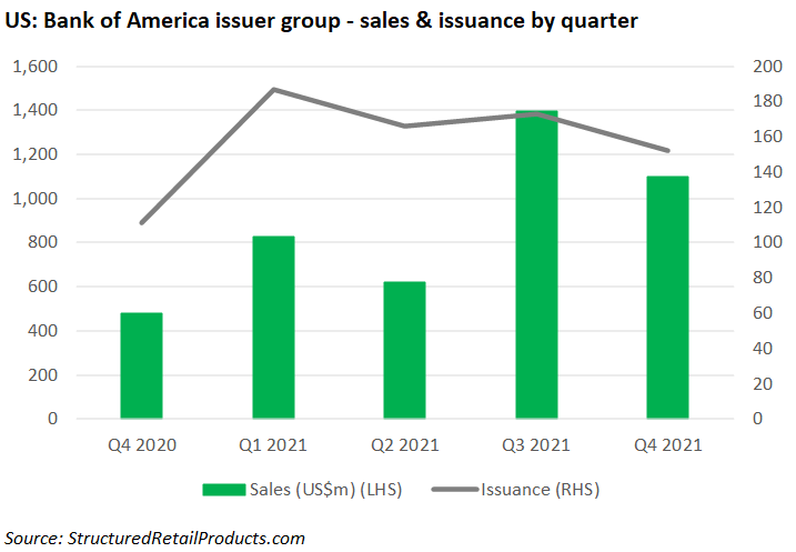 BofA was in the top 10 list of issuer groups in Q4 21 in which Morgan Stanley led the ranks in with US$3.4 billion (857 products). Citi followed behind with US$3.1 billion (913 products), JPMorgan issued US$2.9 billion (1,390 products), and Barclays issued US$2.8 billion (567 products).