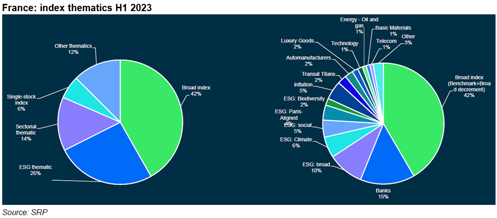 Sales of products linked to ESG indices totalled €2.1 billion – the equivalent of a 25.6% share of the index-linked market. Their exposure was split between broad ESG indices (9.6%), ESG climate (5.6%), ESG social (4.6%), ESG Paris-Aligned (4%), and ESG biodiversity (1.8%).