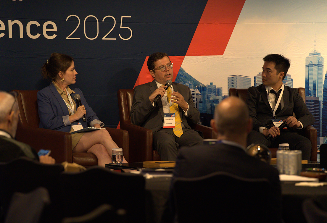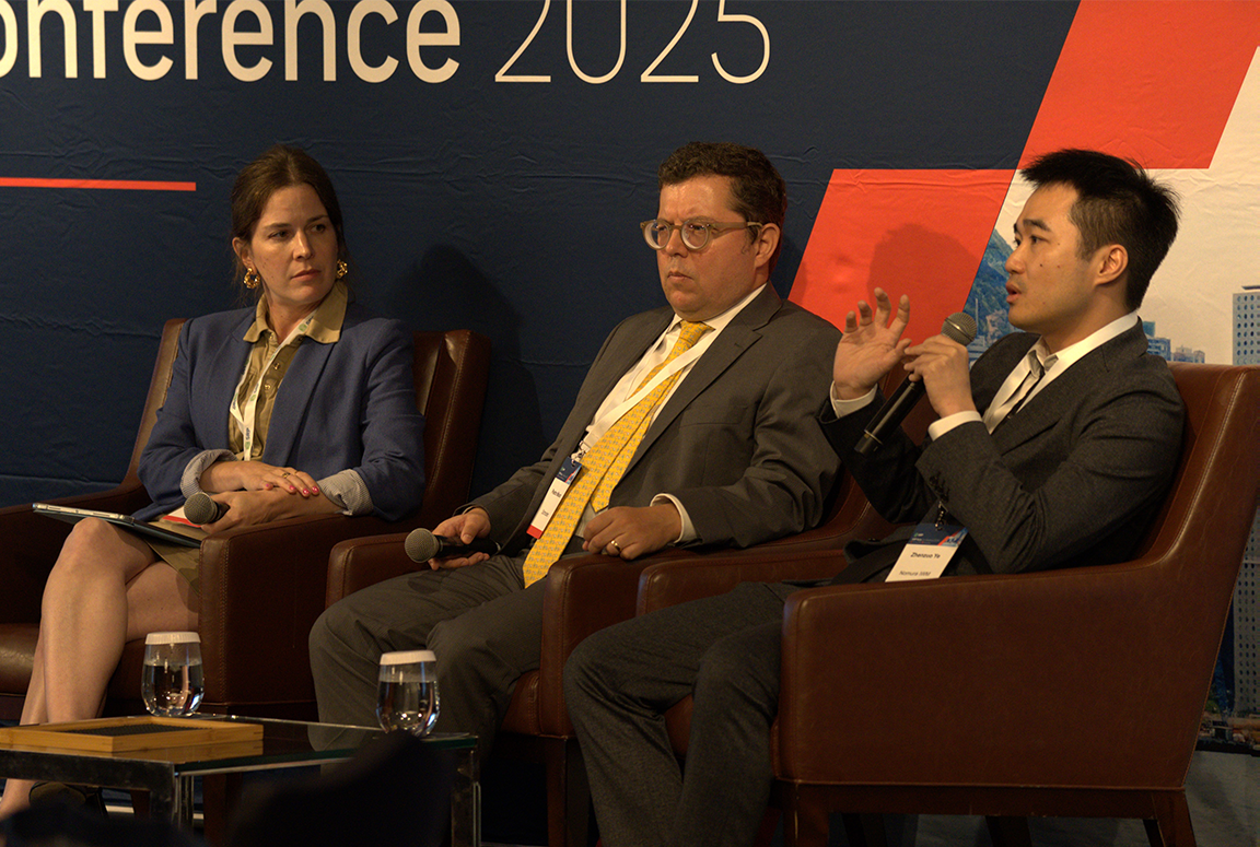 Left to right: Amélié Labbé, SRP (moderator); Pedro Moura, Schroders; and Zhenzuo Ye, Nomura IWM
