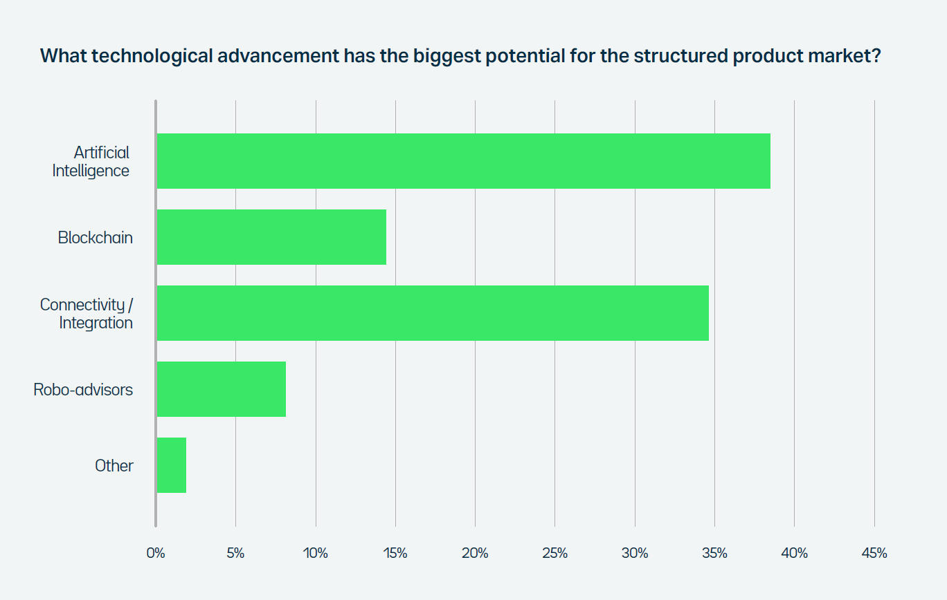 Almost two fifths (39.4%) of respondents identified AI as the single most important future technology, though the structured products industry is still in the relatively early stages of AI integration.