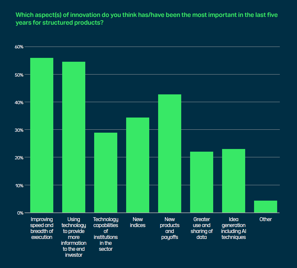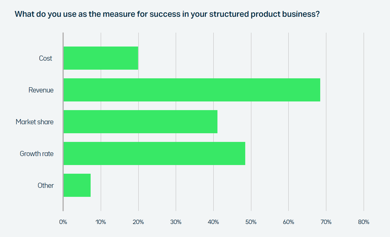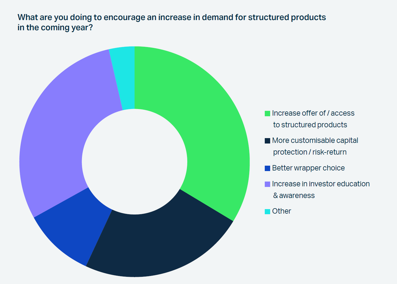 When asked what firms are planning to do to stimulate demand for structured products in the coming year, again with more than one choice allowed, 70% of respondents said they are increasing their offer of, and access to, structured products. 61% of respondents said they are increasing investor education and awareness as a way to increase demand.