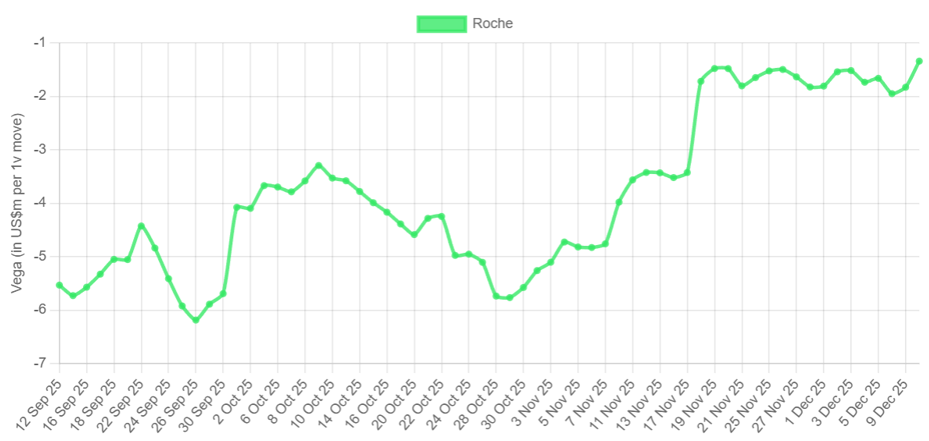 And here the Vega graph of all Roche-related structured products (being representative) that are considered for the SRP Greeks platform: within that period, Roche saw a sharp increase, so it makes sense that Vega risk has also declined. And since volatility shifts impact Vega, that's Vomma at work. (See the previous article on unusual Greeks).