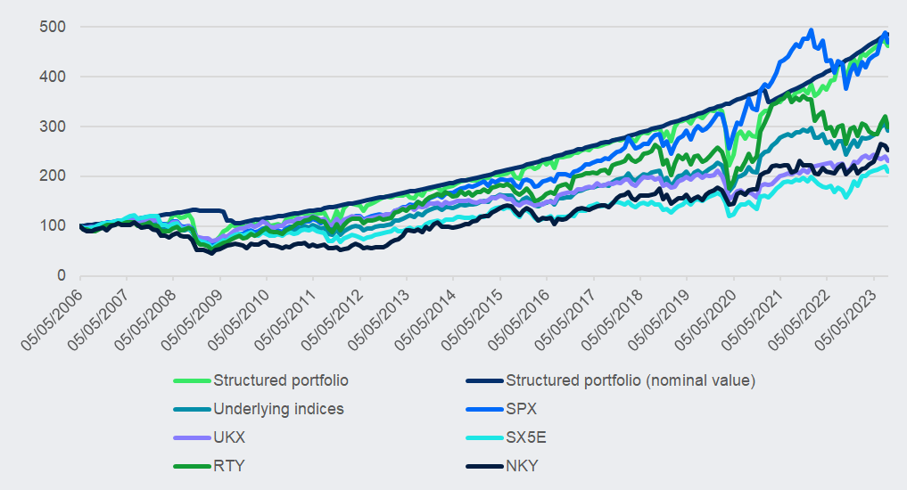 The resulting strategy, based on continuous reinvestment of autocallables upon product maturity, could then be compared to the equally weighted portfolio of the underlying indices.