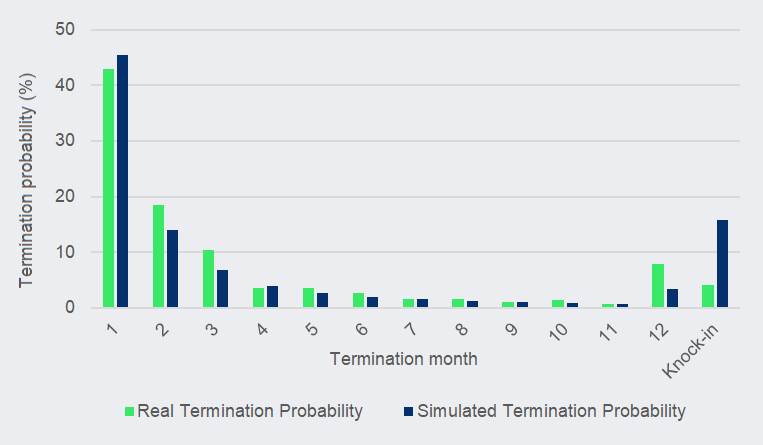 Because of the inflated implied volatility, the simulations from the pricing model overestimates the likelihood of knock-in events by a factor of nearly four. Thus, one receives a high coupon rate based on this overestimated tail risk, while the actual risk is considerably lower.