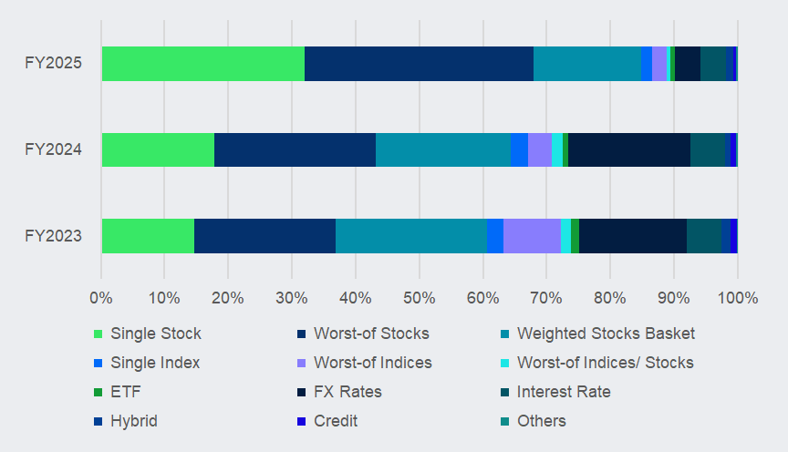 Single stock structures followed closely, taking up around 32% of the regional market share. Most of these volumes came from products sold in Hong Kong’s ELIs, which recorded over 28,000 single stock issuances in 2025.