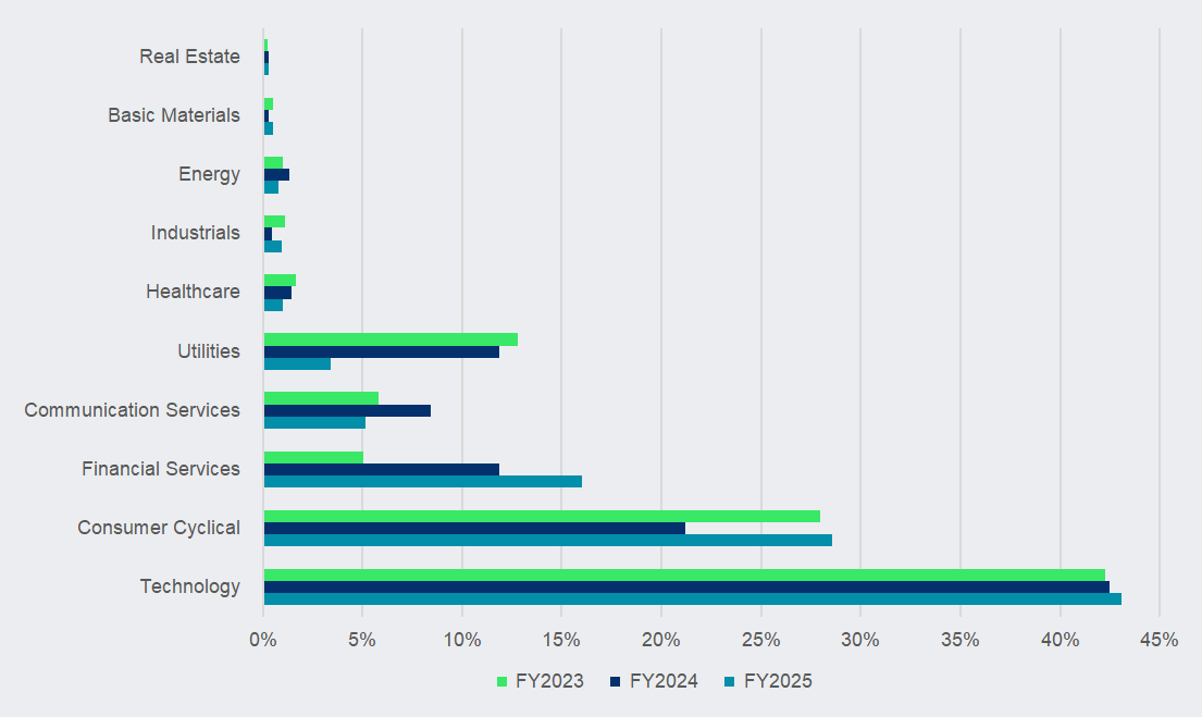 The tech sector’s market share has been above 40% for the past three years.