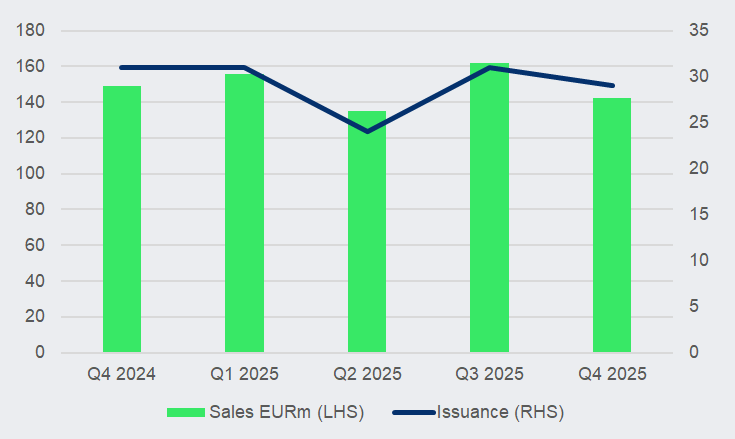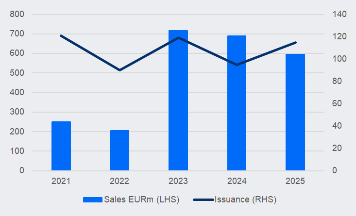 Sales for full year 2025 reached €595m – down 14% compared to the previous year. Issuance increased from 95 products in 2024 to 115 products this time around.
