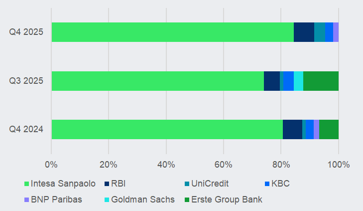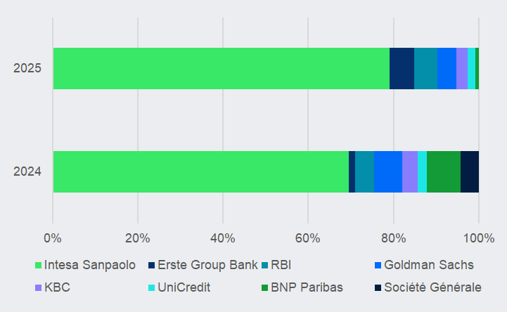 Intesa Sanpaolo was also the main issuer group for full year 2025, achieving 79% market share (2024: 70%) ahead of Erste Group Bank (six percent vs one percent in 2024) and RBI (five percent vs four percent).