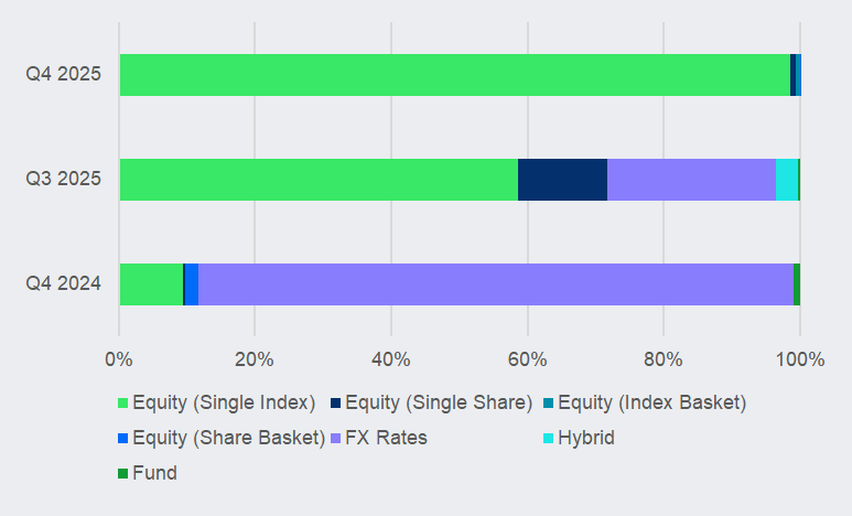 Products linked to a single equity index increased their market share from 59% in Q3 2025 to 98% this time around; YoY their market share was up by a significant 89percentage points.
