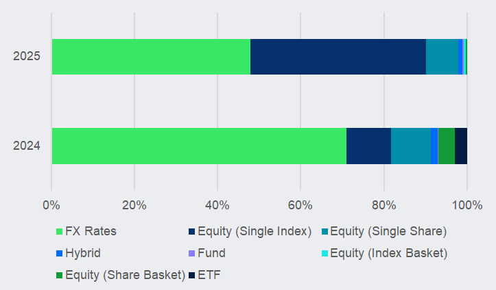 Despite their absence in the fourth quarter, products linked to FX-rates claimed the highest market share in 2025, capturing 48% of all sales (2024: 71%), ahead single equity indices (42% vs 11% in 2024) and single stocks (eight percent vs 10%).