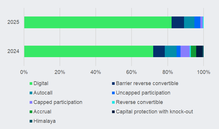 The digital payoff also dominated in full year 2025 with 82% market share vs 72% the previous year. Market share for barrier reverse convertibles and autocalls remained stable, at seven percent and six percent, respectively.