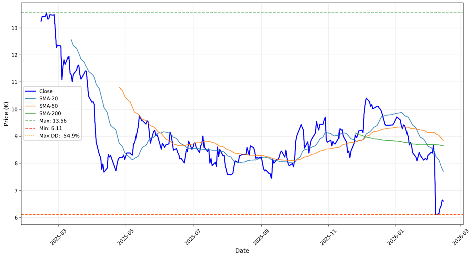 Consequently, the company eliminated its dividend and confirmed losses for 2025. This announcement triggered a significant share price decline of approximately 25% (based on closing prices) on 6 February 2026, as illustrated in the graph below.