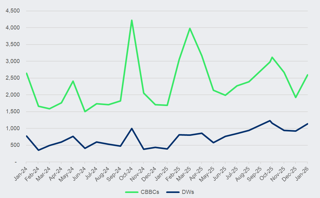 DWs’ average daily turnover rose more than 77% year-on-year to HK$7.8 billion in January, while CBBCs’ doubled to HK$14.2 billion.