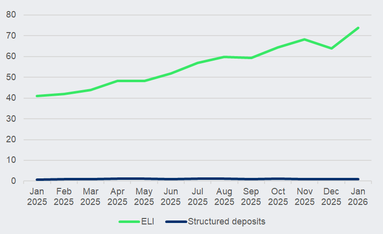 On the unlisted structured products front, over 7,500 equity-linked investments (ELIs) and 2,100 structured deposits were issued in January that sold to the city’s retail segment.