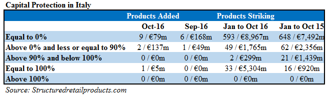 This year, there have been 33 products issued that offer capital returns equal to 100% of the initial investment, a market share of 34%, far above the 7.5% recorded over the same period last year. The increase is even more impressive if all knockout products and reverse convertibles with a low barrier are taken into account. "Investor demand for capital protection, either unconditional or conditional, is strong," said Amiotti.