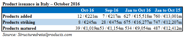 Six hundred and twenty-seven structured products with estimated sales of €15.52bn have been added to the SRP Italy database this year, a large increase in sales from the same period last year, when 760 products worth €13,001m were added.