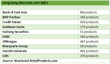 SRP data also shows that the competitive landscape in the warrants market in Hong Kong continues to be dominated by foreign banks with JP Morgan leading the pack (447 live products), followed by Credit Suisse (435 live products); Societe Generale (401 live products), UBS (370 live products) and HSBC (344 live products).